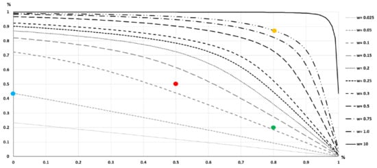 Convex curves do achieve high values of percentage of area (e.g., 90.1, 96.7, 99.1 for widths of 0.25, 0.5 and 1 m respectively). To understand how this graph works, first let us look at a value of voxel-overlapping (e.g., 80%) and then at the curves corresponding to the wi value of interest (e.g., 0.1 m and 1 m). The cross between the curve corresponding to w = 0.1 m with the vertical for 80% of voxels-overlapping gives ≈18% (green point). This value means that when working with w = 0.1 m there is 18% of the area that has more than 80% of voxel-overlapping. On the other hand, it also indicates that approximately 54% (=72% − 18%) of the area has voxel-overlapping less or equal than 80%. The interpretation is exactly the same for the case of the curve corresponding to w = 1 m. The cross between the curve corresponding to w = 1 m with the vertical for 80% of voxels-overlapping gives ≈88% (yellow point). This value means that when working with w = 1 m there is 88% of the area that has more than 80% of voxel-overlapping. On the other hand, it also indicates that approximately 11% (=99% − 88%) of the area has voxel-overlapping less or equal than 80%. This graph allows us to determine the value of w that would offer a certain percentage of voxel-overlapping affecting a certain percent of the area. For example, if you want at least 50% of the area to have a 50% or more overlap level, we must look at the point (overlap ≥ 50%, area ≥ 50%) (red point). Any curve that passes above this point meets these conditions. In the case of Figure 11, the curve corresponding to wi = 0.15 m is the first one that satisfies this double condition.