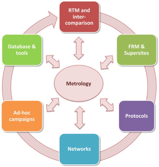 - Geographical coverage—The uncertainty budget of satellite EO data should ideally be assessed at global scale in order to verify the accuracy of the used retrieval algorithms over a wide range of biomes and eco-climate conditions. This translates into the need of a network of globally distributed sites, providing continuous, representative and consistent measurements of the same geophysical quantity. The fulfilment of this requirement has some non-negligible costs, which are difficult to cover as part of a single mission or Agency’s budget. At the present time, except for the Aerosol Robotic Network (AERONET) [52], there are no operational Land Cal/Val networks entirely fulfilling this need. The pragmatic approach to this problem consists in reinforcing international collaborations, leveraging on existing regional and continental infrastructures, with the objective to build a network-of-networks system. This approach is now being considered in the frame of the Copernicus Ground-Based Observations for Validation (GBOV) [53].