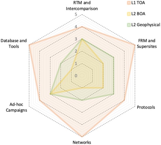 - EDAP Product Quality Evaluation Matrix [63]—The Earthnet Data Assessment Pilot (EDAP) matrix, which is an evolution of the QA4ECV matrix [40], aims at providing to the users a readily accessible overview of the relevant EO satellite data products quality and fitness for purpose. The quality assessment addresses specifically the following main EO products characteristics: format and accessibility, products and algorithm documentation and quality flags, uncertainty characterisation and validation results. For each feature of the identified product, a ranking is provided with colour coding, providing easy and quick information on the overall quality of the considered EO data. While the previous definitions are mainly focusing on bio-geophysical variables, the EDAP quality matrix is a cross-cutting concept, which can be equally applied to any satellite-based product level. This matrix contributes to the effort of standardisation in the quality assessment procedures for EO satellite data. The EDAP matrix is therefore pivotal in moving towards enhanced interoperability in the EO domain.
