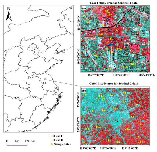 Spatial distribution of the study areas where (a) Case I is located in the megacity, Beijing and (b) Case II is located in part of Huai’an, China. The background image is false color composite with Sentinel-2 (RGB: band 8, 4, 3) where vegetation is red, water is dark blue, and cities are blue–gray.