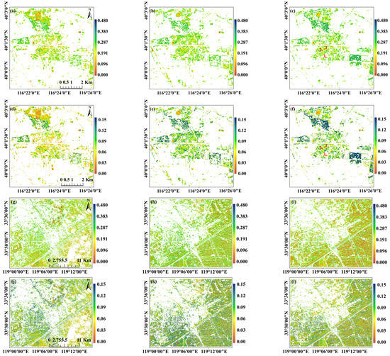 Spatial distribution of ShDI and SiDI based on Sentinel-2 data where (a–c) are ShDIs in Case I on 28 August 2016, 5 September 2018, and 19 September 2020, respectively; (d–f) are SiDIs in Case I on those days; (g–i) are ShDIs in Case II on 26 July 2016, 9 September 2018, and 3 September 2020, respectively; (j–l) are SiDIs in Case II on those days.