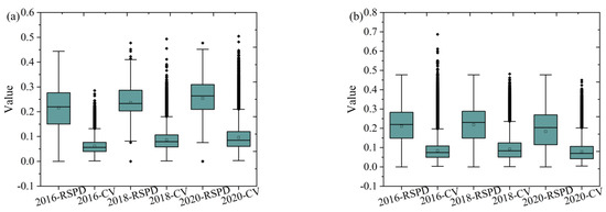 The temporal change trend of RSPD and CV, where (a) is the result of Case I study area and (b) is the result of Case II study area.