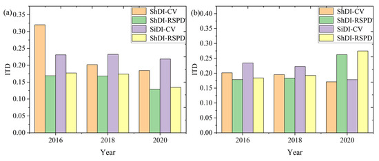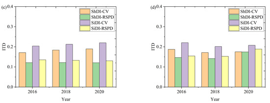 Figure 6c,d show the ITD between the RSPD/CV and the ShDI/SiDI at various times during 2016–2020. The horizontal axis represents the temporal variation, and the vertical axis indicates the value of the ITD. A greater ITD corresponds to a greater RSPD/CV −ShDI/SiDI spatially distributed difference. It can be seen from Figure 6 that the ITD value between the RSPD and ShDI/SiDI is generally smaller, while the ITD value between the CV and ShDI/SiDI is generally bigger. These results indicate that the diversity indicated by the RSPD is in good agreement with the spatial distribution pattern of ShDI/SiDI. Moreover, the RSPD results outperform the CV in all cases and study periods.