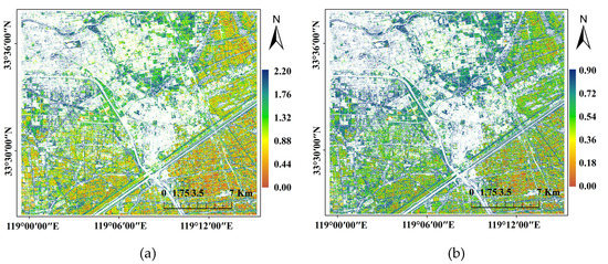 Spatial distribution of ShDI and SiDI of Pléiades data in Case II region in 2018 ((a) is ShDI, (b) is SiDI).