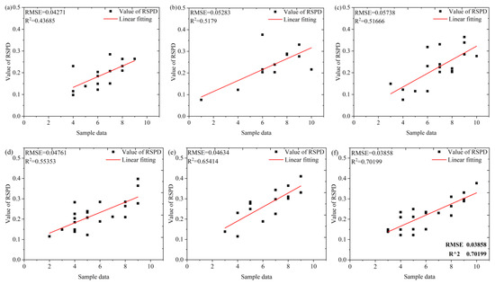The correlation between the RSPD and the plant diversity grade of sample sites where (a–c) are the results of Case I in 2016, 2018, and 2019, respectively; (d–f) are the results of Case II in 2016, 2018, and 2019, respectively.