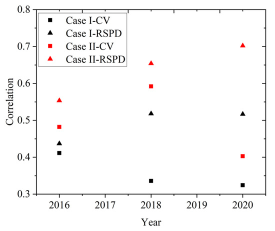 Figure 5 shows the spatial distribution of ShDI and SiDI for Case I and Case II. First of all, the distribution results are consistent with the spatial patterns and variation trend of the RSPD. Additionally, Figure 6a,b present the correlation coefficients between the ShDI/SiDI and RSPD/CV. The correlation coefficients between the RSPD and ShDI/SiDI are greater than 0.9 with p-value = 0.01.