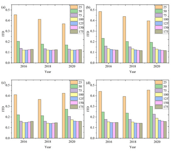 In the calculation of RSPD, the number of segments () in Equation (4) was set as 100 according to comprehensive experiment analysis. To investigate the influence of on the RSPD, we calculated the RSPD with different numbers of , varying between 25 and 175 in the study areas, Case I and Case II, respectively. The ITD consistency analysis between the RSPD and ShDI/SiDI was carried out to determine the appropriate . Figure 15 shows the ITD results between the RSPD and ShDI/SiDI. As can be seen from the figure, when the changed from 25 to 75, the ITD decreased significantly, implying that the performance of the RSPD would be promoted with the increasement of . However, when the changed from 100 to 175, there was very little variation in the ITD, implying that the effect of promotion by increasing the is limited or convergent. Too large a value of the would increase burden on the calculation of the RSPD. Consequently, it is appropriate to set as 100 in this study.