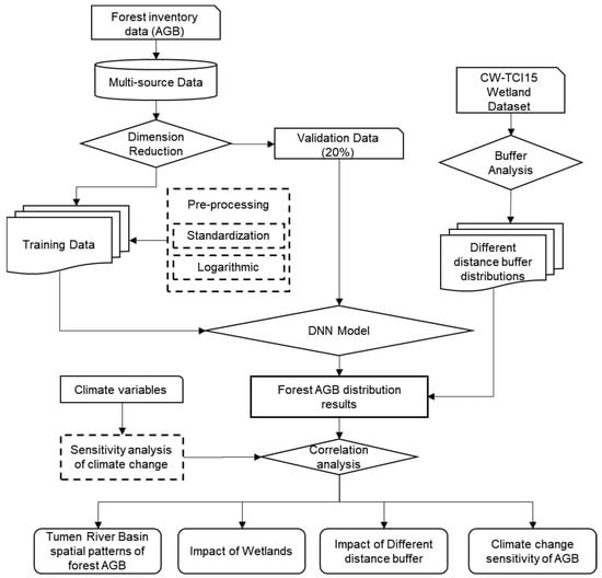 This study used a DNN method to quantify the distribution structure of forest AGB and explores the impact of inland wetland degradation on forest AGB in the Tumen River Basin (Figure 1). This research is expected to improve the understanding of the protection of wetland forest ecosystems at the basin scale and provide an important theoretical basis for the establishment of regional ecosystem models.