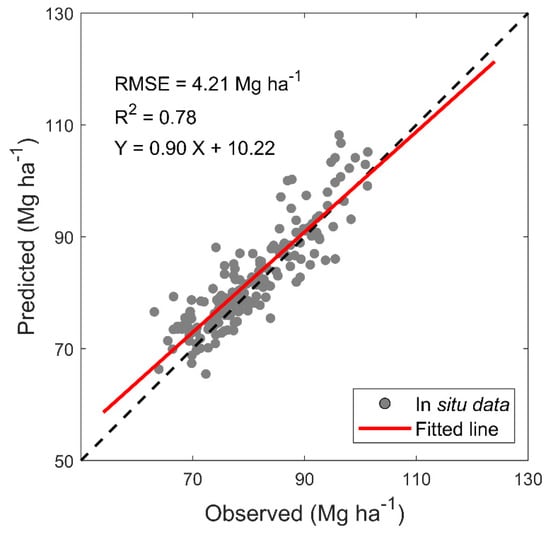In Equation (1), the model explains 82% of the variance in AGB field measurements and the standard error is 6.77 Mg ha−1. Based on the verification results, we believe that the relationship between H and AGB established by the model can be used to expand the measured data from GLASs footprint data.