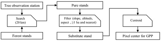 The phenological observations were not always made in the middle of a forest with a significant cover of the plant species being observed. Therefore, to be able to retrieve remote sensing information that reflects ground observations to some extent, the nearest forest stand [48] within a radius of 20 km [49] from the observed tree and with comparable station characteristics was identified. Given the original observation station characteristics (altitude, slope, and aspect), the substitute location used as the centre for the remote sensing data pixel had characteristics not exceeding altitude ± 200 m, slope ± 10°, and aspect ± 1 class (note that aspects represent the standard 1 to 8 categorisation, i.e., N, NE, E, SE, S, SW, W, and NW, with −1 for flat areas). In addition, only stands larger than 1 ha (10,000 m²) qualified for use as a substitute site. This threshold was based on the assumption that if a tree species is represented as nearly pure in 1 ha, it is likely to be present as a secondary species in the rest of the pixel, therefore contributing substantially to the pixel value (note that most of the species included in this study do not form pure stands over extended areas in Slovenia). From the qualifying forest stands satisfying the aforementioned criteria, the nearest stand to the observation station was used as a substitute stand. The centroid of the substitute stand was used to retrieve remote sensing information from Google Earth Engine for the period 2003 to 2020. The previous routine (the generation of the pixel centre from the observation station) applied for each combination of station and tree species using the ArcGIS desktop software (version 10.7.1) is summarised in Figure 2.