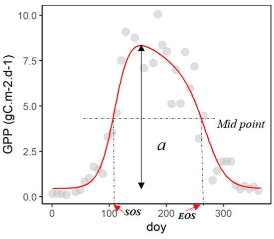 The 8-day aggregate GPP data were used to reconstruct continuous daily GPP values. First, a fraction of 1/8 was applied to obtain the 8-day average from the downloaded 8-day sums. Then, each year of data was fitted with the best (low RMSE) of (i) a Gaussian function, (ii) a double logistic function after [25], and (iii) another double logistic function after [26]. (ii) and (iii) were performed using the greenbrown package (version 2.5.0) in R (see function equation details in the respective studies), while (i) was performed using non-linear least squares regression also in R, by fitting the following standard Gaussian function: