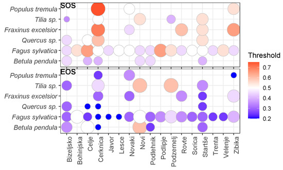 The best thresholds varied substantially between the different combinations of stations and species, and also between SOS and EOS (Figure 4). In general, the best thresholds obtained for SOS are around 0.5, with few combinations of station and species being higher, up to 0.7. For EOS, the best threshold is lower than 0.5 for most combinations of station and species, the minimum being 0.2 for Populus tremula at Zibika, Fagus sylvatica at Cerknica, Javor, Lesce, Betula pendula at Cerknica, and Quercus sp. at Celje and Cerknica. The few exceptions (EOS threshold of 0.5 and 0.6) are Betula pendula at Novi and Celje, Fagus sylvatica at Novi and Bohinjska, and Tilia sp. at Novi and Podzemelj. No plant species stands out consistently as having high or low thresholds of SOS and EOS across all stations.