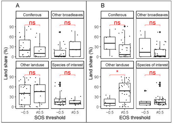 Mann–Whitney test for comparing the share of different land uses for two groups of best thresholds (~0.5, i.e., 0.45 to 0.55, and ≠0.5, i.e., <0.45 or >0.55) at the substitute forests for SOS (A) and for EOS (B). “ns” and “*” mean non-significant (p-value ≥ 0.05) and significant (p-value < 0.05) difference, respectively.