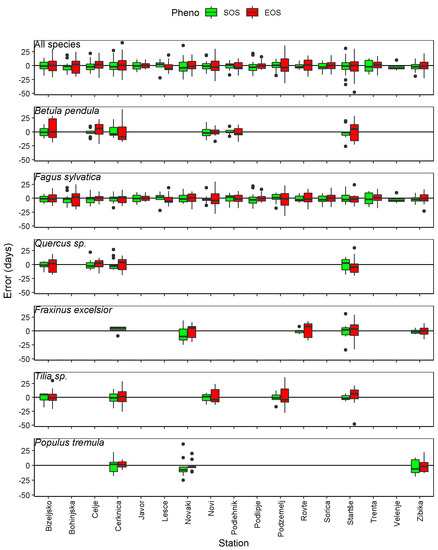 The absolute errors in the modelled SOS and EOS are relatively well spread around the zero-line for all tree species (Figure 6). Errors located above the zero-line represent overestimated SOS or EOS, and errors located below the zero-line represent underestimated SOS or EOS. Overall, the absolute errors are larger for EOS compared to SOS, as denoted by the generally longer boxes. The larger absolute errors of EOS are particularly noticeable at some stations and for specific years, with the highest error at Starše in 2012 for Tilia sp. (error of −48 days).