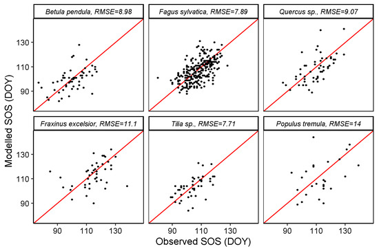 Scatter plots of modelled vs. observed SOS (Figure 7) or EOS (Figure 8) based on the holdout years (left out during training) show relatively low RMSEs in general, considering the original temporal resolution of the remote sensing data (8 days). For SOS, the lowest RMSE of 7.71 days was recorded for Tilia sp. A comparable RMSE of 7.89 days was obtained for Fagus sylvatica. The highest average RMSE recorded is 14 days for Populus tremula. The RMSEs of other species Betula pendula, Quercus sp. and Fraxinus excelsior were 8.98, 9.07 and 11.1 days, respectively.