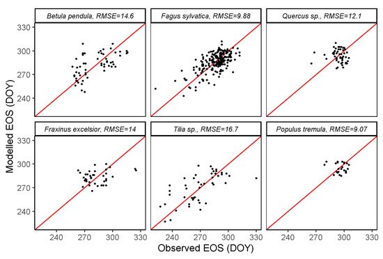 The RMSE recorded for EOS is generally greater than 10 days, with the exception of Fagus sylvatica and Populus tremula (Figure 8). While the errors for EOS are generally higher than for SOS, this was not the case for Populus tremula (9.07 days for EOS vs. 14 days for SOS).