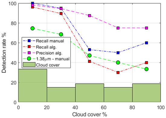 Step 5 is essential because step 2 results in a large number of false alarms, especially in images with cauliflower clouds as their edges are prone to the parallax effect. However, their positions are much more irregular, whereas aircrafts appear as pearls on a string. This is exploited by the high velocity and low scatter conditions, which effectively removes most false alarms. The false alarm threshold σ < V/5 is chosen by experience in order to reduce false alarms maximally while retaining most aircrafts. This results in high recall values.
