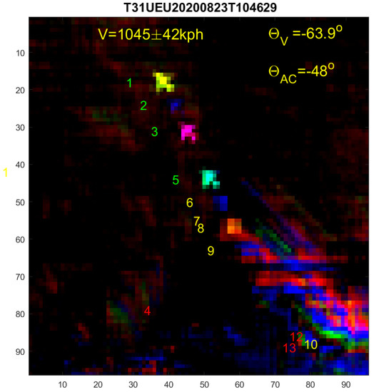 Ideally, M = 13, when all bands are included, but in cloudy backgrounds, the low-resolution bands often fail, and we therefore sum the four high-resolution bands only as they are more precise. By minimising this variance, which is equivalent to a two-parameter linear regression, we obtain the best fit values for aircraft position and apparent velocity vector .