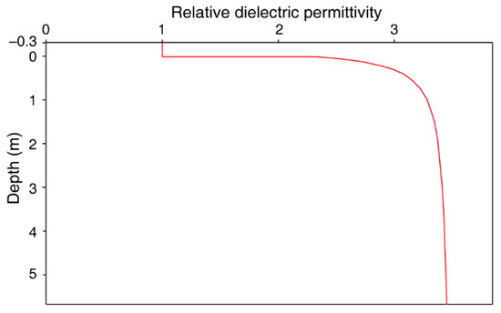 The 1D background model of relative dielectric permittivity of the lunar regolith. There is a 0.3 m vacuum layer between the radar antennas and the lunar surface.