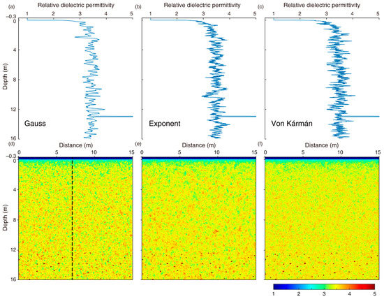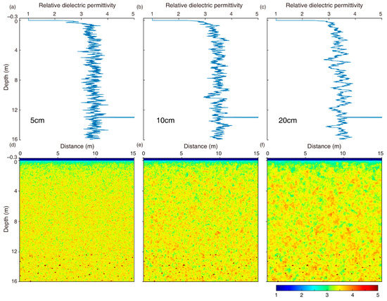 Exponential ACF models with different correlation distances. (a–c) Fluctuation of the 1D probe along the center of 2D model. (d–f) 2D relative dielectric permittivity models with three correlation distances. The correlation distances were (a,d) 5 cm, (b,e) 10 cm, and (c,f) 20 cm, respectively. The RMS perturbation is 5%.