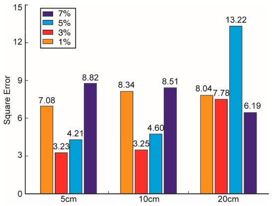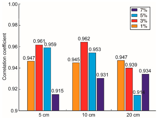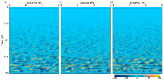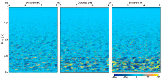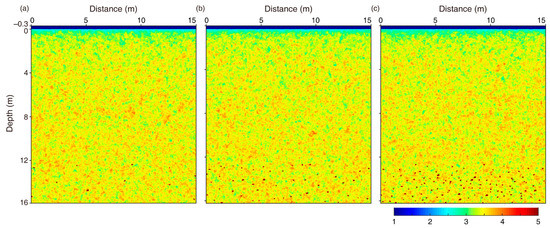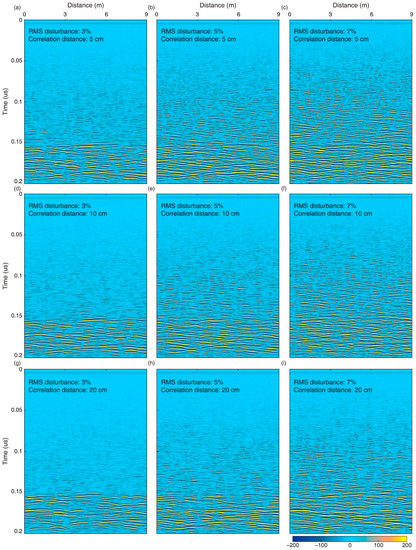 In this paper, we only present 12 models with three correlation distances (i.e., 5, 10, and 20 cm) and four RMS perturbations (i.e., 1, 3, 5, and 7%). However, we actually tested a large number of various models to estimate the possible ranges of all parameters. Similarly, significant efforts were also made for estimating the rock diameter and spatial density. We used the 2D finite-difference time-domain method to simulate the LPR data [16,26]; unfortunately, even for a 2D model, and using an appropriate setting for the finite-difference method to avoid evident artifacts [16], processing would take about one day (~24 h) when running on a supercomputing cluster with 40 cores; that is, 3D numerical simulations are almost unaffordable at present, even though the radar waves are actually propagating through 3D random media.