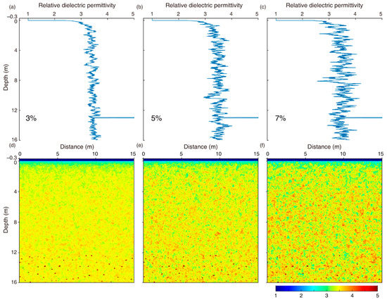 Exponential ACF models with different RMS perturbations. (a–c) Fluctuation of the 1D probe along the center of the 2D model. (d–f) 2D relative dielectric permittivity models with three perturbations. The RMS perturbation were (a,d) 3%, (b,e) 5%, and (c,f) 7%, respectively. The correlation distance is 10 cm.
