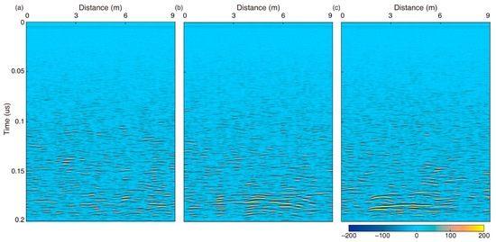 The simulated LPR profiles using the models shown in Figure 7. (a) Without rocky blocks; (b) with ~20 cm rocks; (c) with a ~1 m rock.