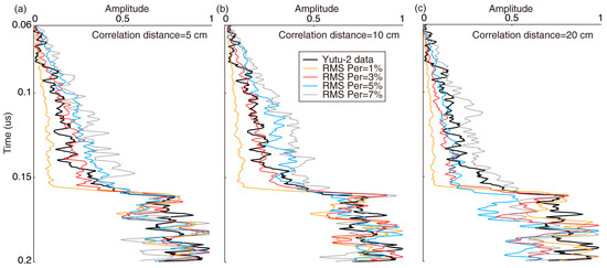 For the sake of simplicity, we only select the critical groups of controlling parameters by plotting them together, as shown in Figure 6, although we actually performed a vast number of numerical simulations. Figure 6 well presents the sensitivity of each controlling parameter. Obviously, a large correlation distance corresponds to weak reflections; in addition, a large RMS perturbation corresponds to strong reflections. Therefore, we can fit the Yutu-2 LPR data by searching for different correlation distances and RMS perturbations to obtain the subsurface features of the lunar regolith at the Chang’E-4 landing site.