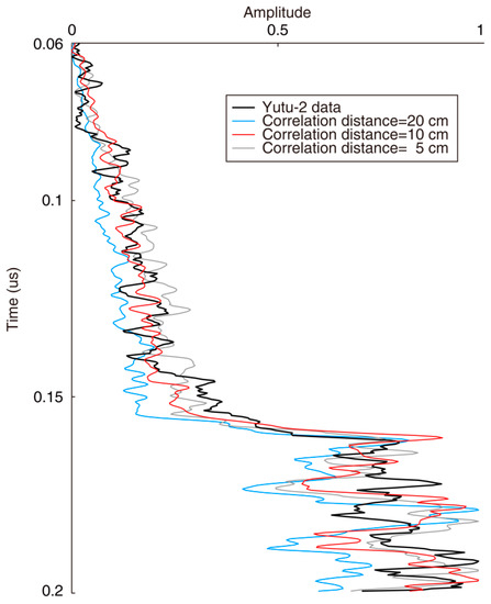Figure 12 shows that a correlation distance of 5–10 cm is the best estimation, because that of 20 cm has a lower correlation coefficient and larger square errors compared with the observed LPR data. These results also indicate that the proposed method is not as sensitive to constraining the correlation distance within a range of 5 to 10 cm, at least compared with its high sensitivity to constraining the RMS perturbation. Considering the relatively small correlation distance and RMS perturbation in the regolith, we argue that this is more likely to be due to structural changes rather than material composition changes.