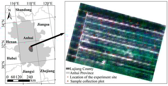 The UAV observation experiment of wheat FHB was carried out at the Anhui Agricultural University Production Base (31°29′N, 117°13′E). The base is located in Lujiang county, Hefei City, Anhui Province, China (Figure 1). In this area, the average annual temperature is 16.2 °C, rainfall is 1262.9 mm, evaporation is 1648.9 mm, sunshine is 1794.3 h, and the frost-free period is 301 days. Owing to the susceptible main wheat variety (Yangmai 25), the abundant fungus sources and favorable climatic conditions in the study area, FHB occurred naturally in the experiment region.