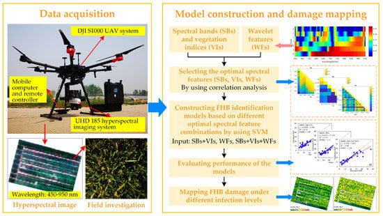 In the present study, we focus on the performance evaluation of a combination of spectral bands (SBs), VIs and WFs extracted from UAV hyperspectral imagery, for the detection of wheat FHB at field scale. The aims are as follows: (1) determine the optimal SB, VI, and WF combinations for wheat FHB detection from UAV-based hyperspectral imagery; (2) evaluate and compare the performance of the optimal combination of SBs and VIs, single WFs, and combination of optimal SBs, VIs, and WFs in wheat FHB detection; and (3) map wheat FHB damage at the field scale using the optimal detection model.