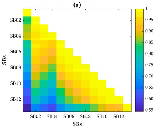 SBs and VIs can be used to evaluate host wheat growth status and physiological changes, while WFs can capture some imperceptible spectral shape changes caused by the infection’s progression. For the selection of optimal SBs, the DER sensitivities of all 125 bands were first determined through correlation analysis. The statistically significant (p-value < 0.05) SBs among the top 10% bands (top thirteen bands included here) ranked in descending order based on the coefficient of determination (R2) values were then selected as candidate SBs. To select the optimal VIs, ten commonly used traditional vegetation indices sensitive to crop growth and physiological conditions were first calculated to characterize different aspects of the host wheat. Table 1 lists the definitions, equations, applications, and references of these VIs. The indices that showed significant (p-value < 0.05) correlation with DER were then selected as candidate VIs. For WFs, the raw reflectance spectrum was first transformed into a wavelet function set at different scales using the continuous wavelet transform (CWT) [30]. The Mexican hat wavelet was used as the mother wavelet base of CWT due to its similar characteristics to vegetation absorption [25,31]. During the CWT application, only the wavelet powers of the six most effective dyadic scales of 21, 22, …, 26 were retained to ensure accuracy and reduce complexity [25]. Then, the wavelet regions with a significant (p-value < 0.001) correlation between WFs and DER were considered as sensitive wavelet regions, and the WFs with the highest R2 of each sensitive wavelet region were then selected as candidate WFs. To further reduce redundancy among the three candidate feature types, namely, SBs, VIs, and WFs, a threshold segmentation method based on correlation analysis was used. First, the R2 between each feature type was calculated. Then, a threshold of R2 < 0.8 [32]was adopted to determine the optimal SBs, VIs, and WFs for wheat FHB detection.