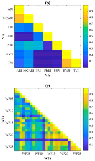 To further reduce the redundancy between the features, the pairwise correlation between the features was calculated and used for threshold segmentation. Figure 4 shows the correlation between the three-type candidate spectral features. Most of the candidate SBs and WFs exhibited high redundancy. For the candidate VIs, only two pairs of indices (ARI and MCARI, RVSI and TVI) had high redundancy. The three SBs, five VIs, and nine WFs were finally selected for wheat FHB detection, using a threshold of R2 < 0.8. The R correlation values between each spectral feature and DER, and their significance levels, are summarized in Table 2. The three optimal SBs, SB01 (478 nm), SB06 (702 nm), and SB13 (946 nm), were in the blue, red-edge, and near-infrared regions. The five optimal VIs were related to chlorophyll (MCARI, RVSI), photosynthetic radiation (PRI), light use efficiency (PhRI), and pigment senescence (PSRI). Of the nine optimal WFs, WF01 (450 nm, scale 23) and WF06 (470 nm, scale 22) were in the blue region, WF07 (502 nm, scale 21) was in the blue-edge region, WF10 (566 nm, scale 22) was in the yellow-edge region, WF12 (618 nm, scale 22), WF13 (618 nm, scale 26) and WF16 (650 nm, scale 23) were in the red region, and WF22 (806 nm, scale 22) was in the near-infrared region. The two SBs and eight WFs in the visible region selected in this study are all in the wavelength ranges of 430–525 nm and 560–710 nm, which is consistent with the findings of Alisaac et al., who found that the spectral reflectance of the visible region at these ranges is highly correlated with FHB [22]. Typically, wheat that is infected with FHB exhibits a powdery discoloration, discoloration, or death of infected spikelets, mostly accompanied by a temporary increase in transpiration and tissue desiccation [50,51]. These phenomena are related to the changes in pigment content (including carotenoid and chlorophyll), water content, and internal structure of the infected wheat ears [24,52]. The above changes will affect the optical characteristics of the wheat canopy, and change its spectral response characteristics. Specifically, in the visible region, the spectral reflectance of wheat infected with FHB is higher than that of healthy wheat [27]. Therefore, the selected SBs and WFs are suitable for detecting infection, and the selected VIs are also effective indices.