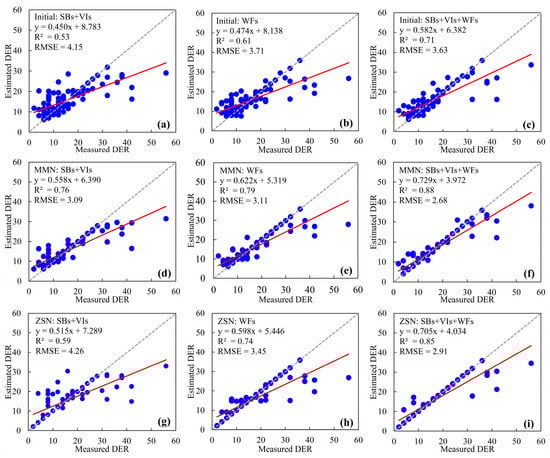 Scatter plots of measured DER versus estimated DER of SVM detection models based on (a–c) initial spectral feature combinations of SBs, VIs, and WFs; (d–f) spectral feature combinations of SBs, VIs, and WFs normalized using MMN algorithm; and (g–i) spectral feature combinations of SBs, VIs, and WFs normalized using ZSN algorithm.