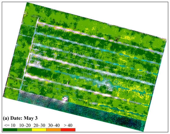 Damage maps of wheat FHB on (a) 3 May and (b) 8 May 2019, obtained using the normalized (SBs + VIs + WFs)-based SVM detection model.