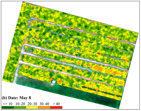 The optimal detection model, based on SBs + VIs + WFs that were normalized using the MMN algorithm, was adopted for mapping wheat FHB damage on 3 May and 8 May 2019. According to GB/T 15796-2011, DER values are classified into the following five ranges that reflect FHB harm degrees: mild (DER ≤ 10), mild-to-moderate (10 < DER ≤ 20), moderate (20 < DER ≤ 30), moderate-to-severe (30 < DER ≤ 40), severe (DER > 40). Figure 6 shows the spatial distribution of FHB-infected wheat on 3 May and 8 May 2019. It can be observed that wheat FHB developed rapidly over a short period of time. In order to quantify the spread, the area proportions corresponding to different FHB infection levels was calculated for the two dates (Table 3). On 3 May, although the wheat FHB infection had spread across the whole field, the overall disease level was moderate or lower. Specifically, the mild-to-moderate infection areas covered the highest proportion (61.4%), followed by mild infection areas (33.7%), and the remaining were mainly moderately infected (4.8%). On 8 May, although the proportion of mild-to-moderate infected areas was still the highest (47.7%), the proportion of moderately infected areas had increased rapidly, from 4.8% to 37.7%. Moderate-to-severe infected areas reached 8.1%, while mildly infected areas only accounted for 6.7%. These results are consistent with the infection characteristics of wheat FHB and our field survey.
