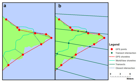 Differences between shoreline from WorldView satellite imagery and field-based surveys from Real-time Kinematic Global Positioning System (GPS) are estimated in two ways: (a) the distance between the GPS point and the nearest WV shoreline vector, and (b) the distance between the GPS approximated shoreline (by connecting the points) and the WVS using the intersection along transects.
