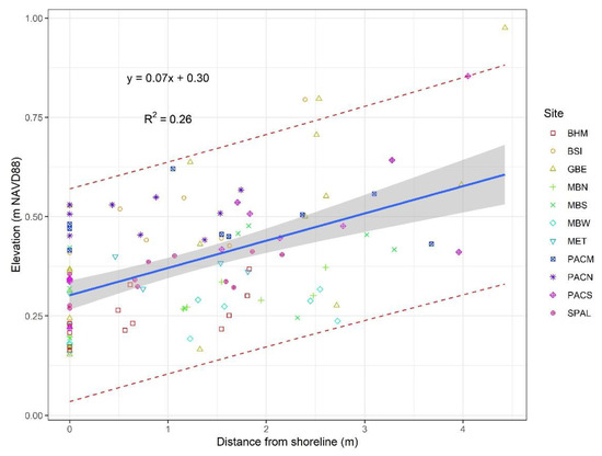 where is the tidally corrected difference between GPSS and WVS, is the uncorrected difference, h is the water level height at the time of image collection, is the elevation of the marsh platform, and ms is the marsh slope. To obtain an estimate of the marsh platform slope (ms), we plotted the field collected GPS elevations against the distance from the shoreline, calculated the linear trend slope (Figure 3). There was a great deal of variability in marsh slope as shown by the low R2 value (0.26) and the site-based slope calculations that range from 0.01 to 0.12 (Table 1) with a mean of 0.06 ± 0.03. However, we chose to use 0.07 as a conservative estimate of marsh slope for the study region rather than spatially resolved GPS elevations from each study site to reduce the possibility of over-correcting the shoreline position for two reasons: (1) marsh tidal flooding has many properties that influence the inundation distance other than slope that would impede water flow which cannot be accounted for, such as surface roughness, sediment type, and vegetation, and (2) if the marsh vegetation canopy is above the water level surface, this procedure could classify it as “land” despite surface inundation based on our method of using NDVI, which detects vegetation.