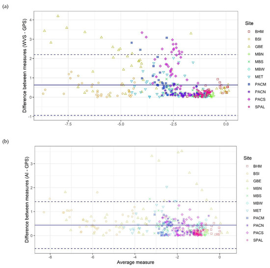 Bland–Altman plots showing the rate of shoreline change from Global Positioning System shorelines (GPSS) only versus shoreline change rates calculated from (a) WorldView-derived shorelines (WVS) exclusively and (b) aerial imagery-derived shorelines (AIS) exclusively. Solid blue line depicts the mean and blue dashed lines show the 95% confidence interval.