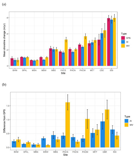 Mean shoreline change calculated for each site using GPSS, WVS, and AIS data are depicted in Figure 5a. Both and were similar to , with the exception of PACS and PACN sites, where calculated higher erosion rates than the .
