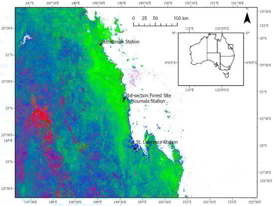 Study site with weather stations at Lethebrook, Koumala, and St. Lawrence-Bowen to Shoalwater and Corio Bays Area Ramsar Wetland, Central Queensland-Landsat fractional cover image visualised by using the Band 1-red (bare ground and rock), Band 2-green (vegetation), Band 3-blue (non-green vegetation indicative of drier habitats with less vegetative cover), provided by [].