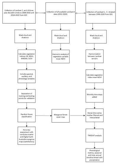 With one of the richest flora in the world comprising thirty-nine species, old-world tropical mangroves found in the Indo-Pacific including Australia are notable for their attributes of species diversity, abundance, and succession and they are therefore considered to be the most dominant and important mangroves globally [,]. We examined decadal changes in mangrove forest cover in Great Barrier Reef catchments using a machine learning approach with the online cloud-computing platform, GEE. With GEE, we compiled a dense time series of NDVI-based Landsat imagery, inputted the time series to the TIMESAT program and investigated the phenodynamics of mangroves at different locations in our study region. This work has relevance to the maintenance of biodiversity, conservation of estuarine wetlands and mangroves, and the role of coastal forests in climate change. To our knowledge, this is the first study to examine and compare the phenology of tropical mangroves with remote sensing time series across different sites adjacent to the Great Barrier Reef, on the east coast of Australia.