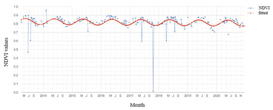 Harmonic regression model original and fitted values of all available (2012–2020) Landsat 8 imagery with mangrove NDVI. The red line is the fitted NDVI values and the blue dotted line is the original NDVI values for mangrove forest in the mid-section of our study region. The site is located directly adjacent to Koumala Station, Figure 1, Bowen to Shoalwater and Corio Bays Area Ramsar Wetland, Central Queensland.