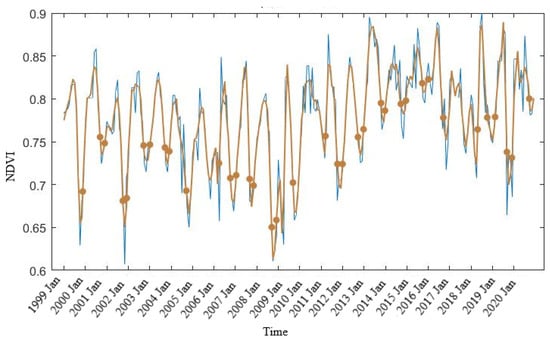Mangrove forest intra-annual smoothing phenology with the Savitzky-Golay filter in TIMESAT using Landsat NDVI dense time-series data 1999–2020, blue line indicates the decadal NDVI data, brown line indicates the smoothed time series fitted data, brown dots display the start and end of the growing season for mangrove forest in the mid-section of our study region, Figure 1, Bowen to Shoalwater and Corio Bays Area Ramsar Wetland, Central Queensland.