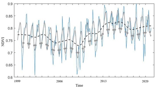 Mangrove forest seasonal trend decomposition in TIMESAT with Landsat NDVI data and dense time-series 1999–2020, black line indicates the seasonal trend, grey dots display the start and end of the growing season for mangrove forest in the mid-section our study region, Figure 1, Bowen to Shoalwater and Corio Bays Area Ramsar Wetland, Central Queensland.