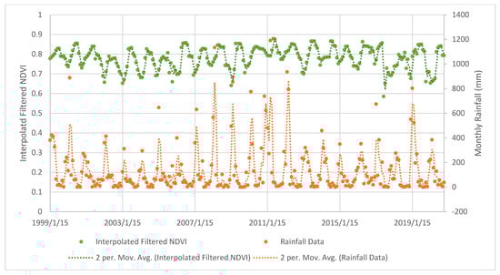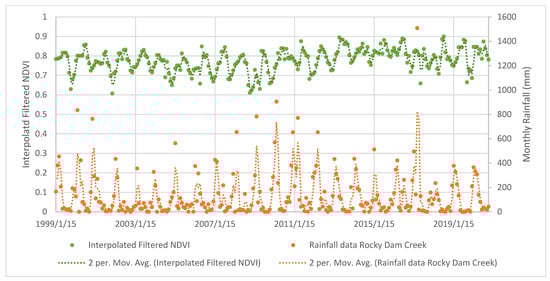 Interpolated, filtered NDVI and rainfall trendlines for the mid-section of our study region, Rocky Dam Creek/Cape Palmerston National Park, rainfall data gathered from Koumala Station (station number: 33038).