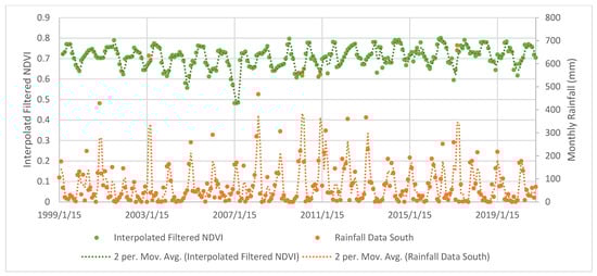 Interpolated, filtered NDVI and rainfall trendlines for the southern section of our study region, Herbert Creek bordering Shoalwater and Corio Bays Area Ramsar Wetland, rainfall data gathered from St. Lawrence Station (station number: 33065).