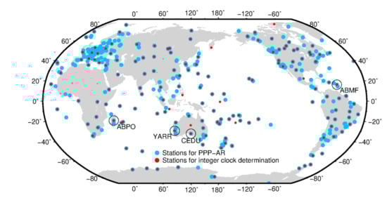 In order to show the impact of attitude quaternion/nominal attitude models on the generation of integer clock products (the network end) and PPP-AR (the user end), we implemented some GPS/BDS PPP-AR experiments using PRIDE PPP-AR II software. As shown in Figure 1, we picked 184 evenly distributed International GNSS Service (IGS) stations [] to compute satellite integer clocks, and 490 globally distributed IGS stations to conduct PPP-AR. We collected 30 s data from day 081 to 110 of 2020. The data processing strategies are listed in Table 1. In the kinematic experiments, ambiguity fixing was achieved through the bootstrapping bias fixing method []. The sequential bias fixing strategy was applied with a round-off criteria of 0.20 cycles for wide-lane ambiguities and 0.15 cycles for narrow-lane ambiguities. Besides, the mean short observation arcs that do not exceed an elevation of 15°, or less than 600 s were not fixed. At each station, the epochs with less than four satellites were removed. A threshold of five times the standard deviation of daily kinematic station coordinates was used to remove those outlier epochs. Then the position accuracy was defined as the mean values of standard deviations. Note that the GEO satellites of BDS were excluded because of their low-precision orbits.