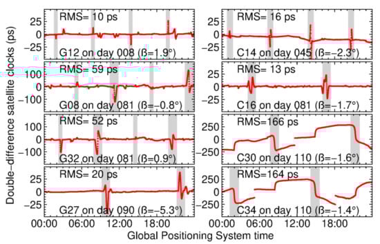 Time series of double-difference satellite clocks for satellites G08, G12, G27, G32, C14, C16, C30 and C34 in 2020. The reference satellites are G01 and C06 for GPS and BDS satellites, respectively. The red dots are the double-difference satellite clocks computed using the clocks based on nominal attitudes and attitude quaternions. The gray zones denote the eclipsing periods of corresponding satellites. The RMS error at the top part of a panel is for the eclipsing period. The average sun elevation angle for corresponding day is shown at the bottom part of a panel. Note that the different panels of the figure have different scales.