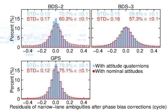 In order to recover the integer nature of ambiguities, the integer clock products were used to correct float ambiguities. Thus, we analyzed the residuals of float ambiguities after using integer clock corrections. The float ambiguities were calculated using daily kinematic ambiguity-float PPP from day 081 to 110 of 2020. In this period, there are 6 days for BDS-2, 10 days for BDS-3 and 24 days for GPS to have eclipsing satellites, respectively. As shown in Figure 3, we calculated the residuals of float ambiguities after correcting integer clocks including the provided attitude quaternions at the user end (see blue bars); for another, we also obtained the residuals using the integer clocks including the nominal attitude (see red open bars). After GPS integer clock corrections with the attitude quaternions, about 80% of narrow-lane ambiguity residuals fall within ±0.1 cycles and its standard deviation is 0.1 cycles, presenting a 4% improvement in residual distribution and a reduction of 0.02 cycles in terms of standard deviation, respectively. Similarly, in the case of BDS-2, the narrow-lane ambiguity residuals have a standard deviation of 0.13 cycles and more than 70% of residuals are within ±0.1 cycles. The distribution of BDS-2 narrow-lane ambiguity residuals generated with the attitude quaternions shows the most evident improvement. Particularly, BDS-3 doesn’t show the huge improvement like BDS-2 though it has longer eclipsing periods. Overall, we demonstrate that the integer clock products generated with attitude quaternions have better performance in recovering integer PPP ambiguities.